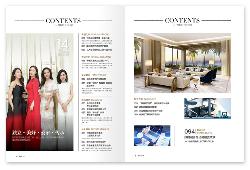內容反映大資管時代財富管理全業態發展,突出專業性和實用性,同時兼備人文關懷,雜志密切追蹤國內國際財富管理前沿動態,深刻解讀財富管理政策,洞察財富管理行業發展趨勢,揭示產品創新投資渠道,闡釋高品質生活方式,倡導健康生活理念,雜志內容主要定位財富管理、高品生活和人文關懷。