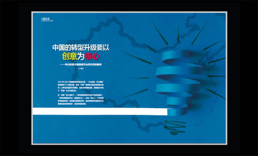 一本以信息服務業、動漫游戲業、設計服務業、現代傳媒業、藝術品業、教育培訓業、文化休閑旅游業、文化會展業等文創產業八大重點發展行業為宣傳重點的刊物。《創意中國》致力于把世界珍奇的創意人才的創造力、創造技能和創意知識產權、具有遠見卓識的金融資本與中國縣域無所不在的自然、生態、經濟、社會、文化資源進行深度融合與無縫對接,在廣袤的中國大地上碰撞出震撼心靈、光耀神州的創意火花,從而創造、延伸出無限的產業、無限的財富,為創意中國點贊。