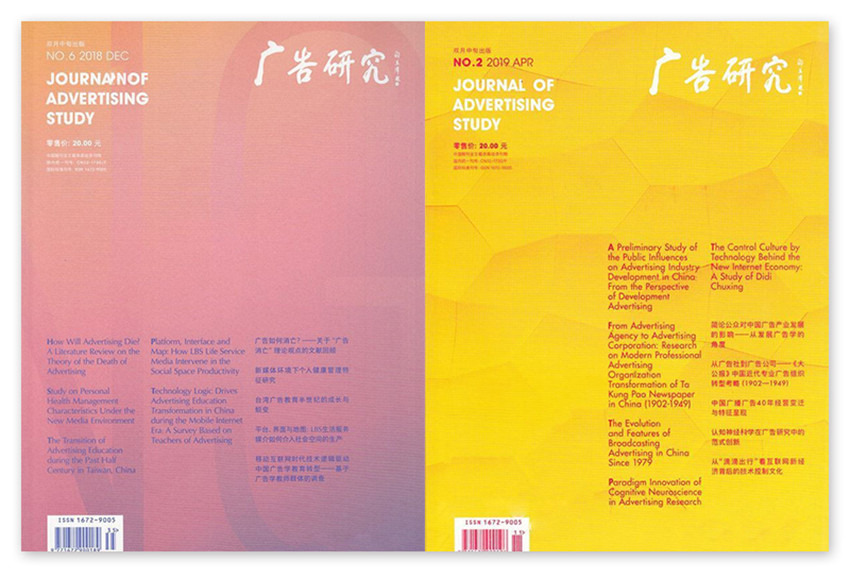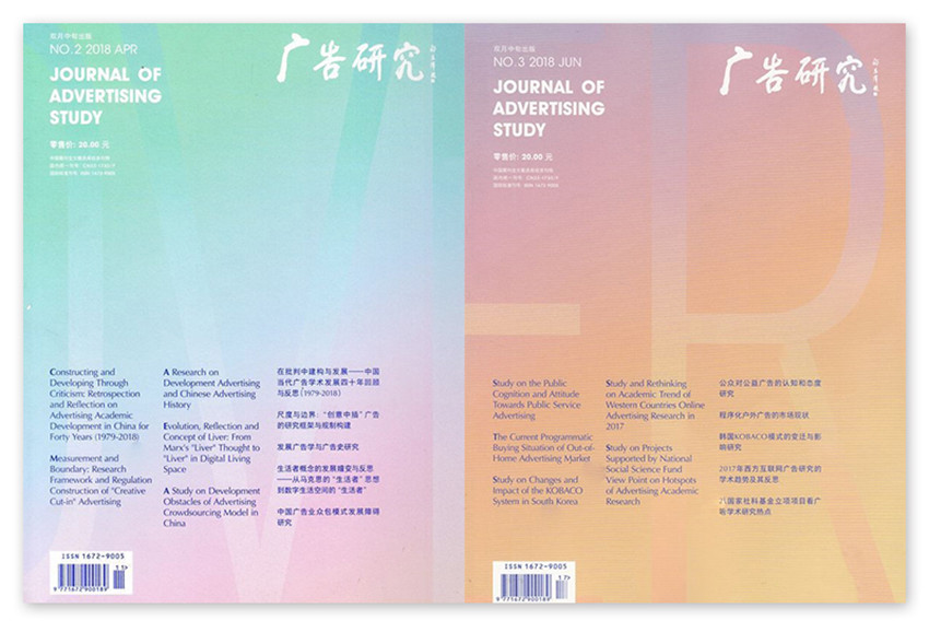 填補了國內廣告業學術性定位核心期刊空白,是華文廣告圈第一本廣告學術研究期刊,讀者推薦:藝術家、潮流人群、廣告設計師、白領一族、時尚藝人;主要欄目:社淪、以研究帶動教學、營銷傳播論壇、新媒體專題、研究生天地、國內動態、國際動態等。