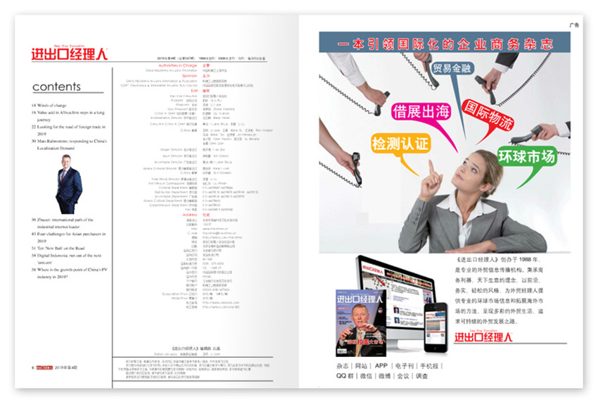 《進(jìn)出口經(jīng)理人》雜志創(chuàng)辦于1988年,注重理論聯(lián)系實(shí)際,創(chuàng)刊多年來得到了長足發(fā)展,雜志內(nèi)容充實(shí)、版式清新,裝幀精美,深受廣大讀者好評,國內(nèi)外公開發(fā)行的一本激揚(yáng)人生的外貿(mào)商務(wù)雜志。