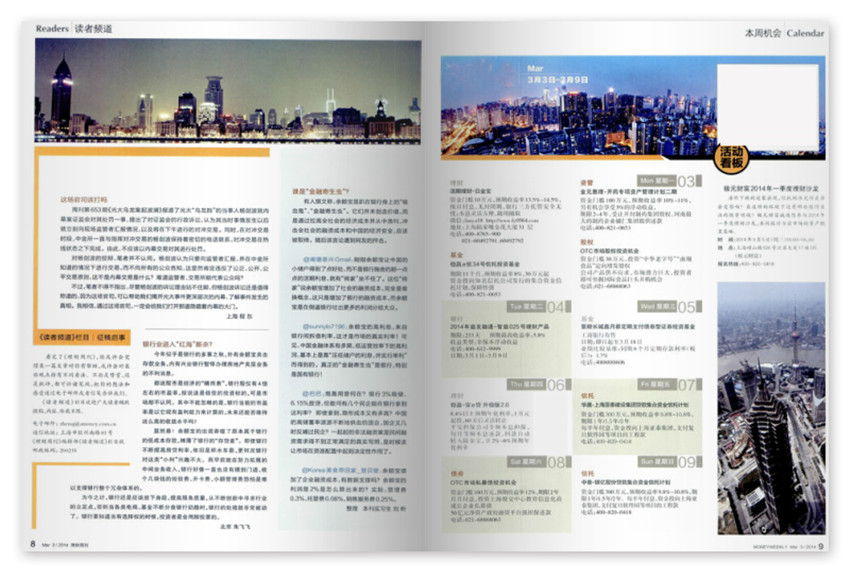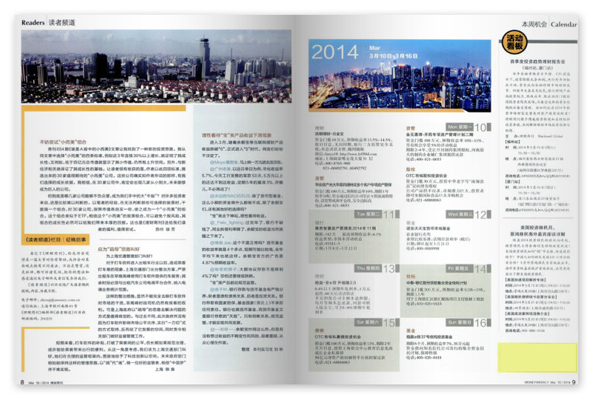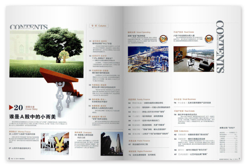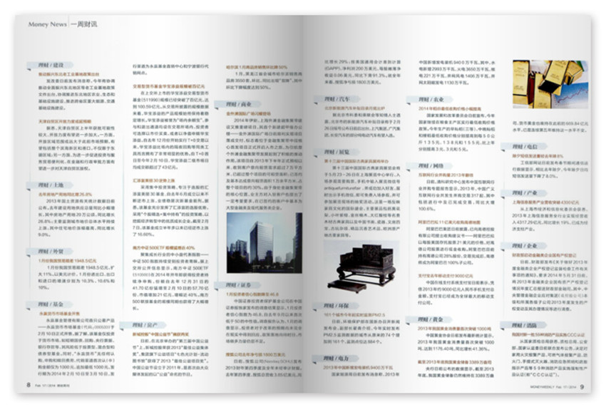 《理財周刊》雜志創辦于2001年,注重理論聯系實際,創刊多年來得到了長足發展,雜志內容充實、版式清新,裝幀精美,深受廣大讀者好評。錢線新聞:“錢沿暸望”、“財事焦點”專題稿件,時效性強,視角獨特的宏觀經濟評論;證券:含股市、基金、債券、匯市、信息性和分析性并舉的投資市場專版。