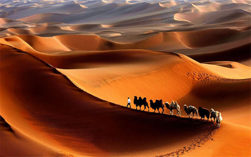 塔克拉瑪干沙漠位于新疆南疆的塔里木盆地中心,是中國較大的沙漠,也是世界第十大沙漠,同時亦是世界第二大流動沙漠。這里,金字塔形的沙丘屹立于平原以上300米??耧L能將沙墻吹起,高度可達其3倍。沙漠里沙丘綿延,受風的影響,沙丘時常移動。沙漠里亦有少量的植物,其根系異常發達,超過地上部分的幾十倍乃至上百倍,以便汲取地下的水分,那里的動物有夏眠的現象。