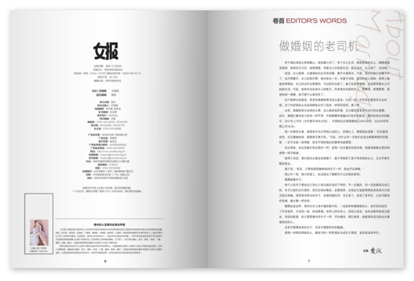 《女報(bào)》雜志創(chuàng)辦于1991年,注重理論聯(lián)系實(shí)際,創(chuàng)刊多年來得到了長足發(fā)展,雜志內(nèi)容充實(shí)、版式清新,裝幀精美,深受廣大讀者好評??堑暮芏辔恼乱呀?jīng)成為影響一群人、一批人甚至一代人的精品,匯聚優(yōu)質(zhì)的編輯和作者資源,用真實(shí)和犀利的編輯思路和審美趣味報(bào)道中國主婦生活以及他們所關(guān)心的一切。