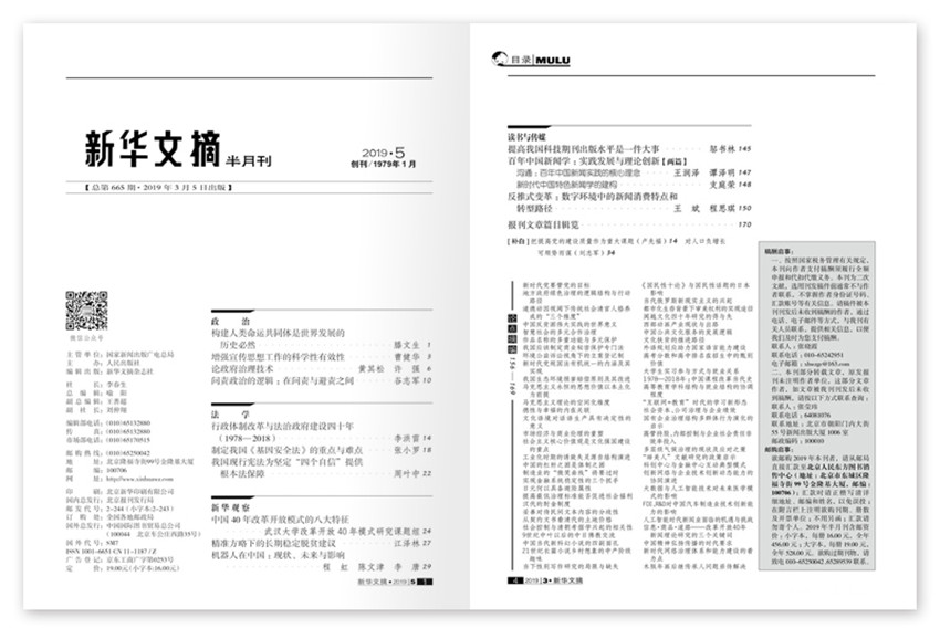 《新華文摘》雜志創(chuàng)辦于1979年,注重理論聯(lián)系實際,創(chuàng)刊多年來得到了長足發(fā)展,雜志內(nèi)容充實、版式清新,裝幀精美,深受廣大讀者好評。