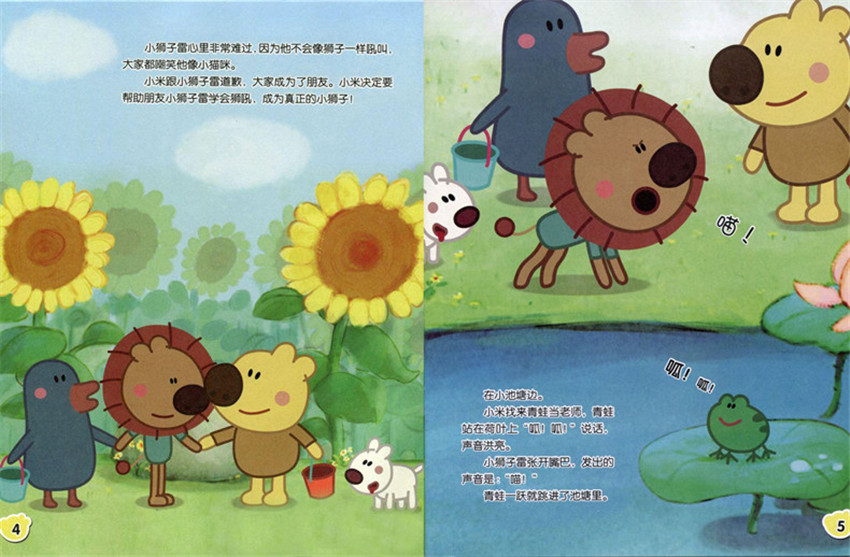 小獅子雷心里非常難過因為他不會像獅子- -樣吼叫,大家都嘲笑他像小貓咪。小米跟小獅子雷道歉,大家成為了朋友。小米決定要幫助朋友小獅子雷學會獅吼,成為真正的小獅子!在小池塘邊,小來找來青蛙當老師,青蛙站在荷葉上呱呱的說話,聲音洪亮。小獅子雷張開嘴巴。發出的聲音是:喵,青蛙一躍就跳進場池塘里。